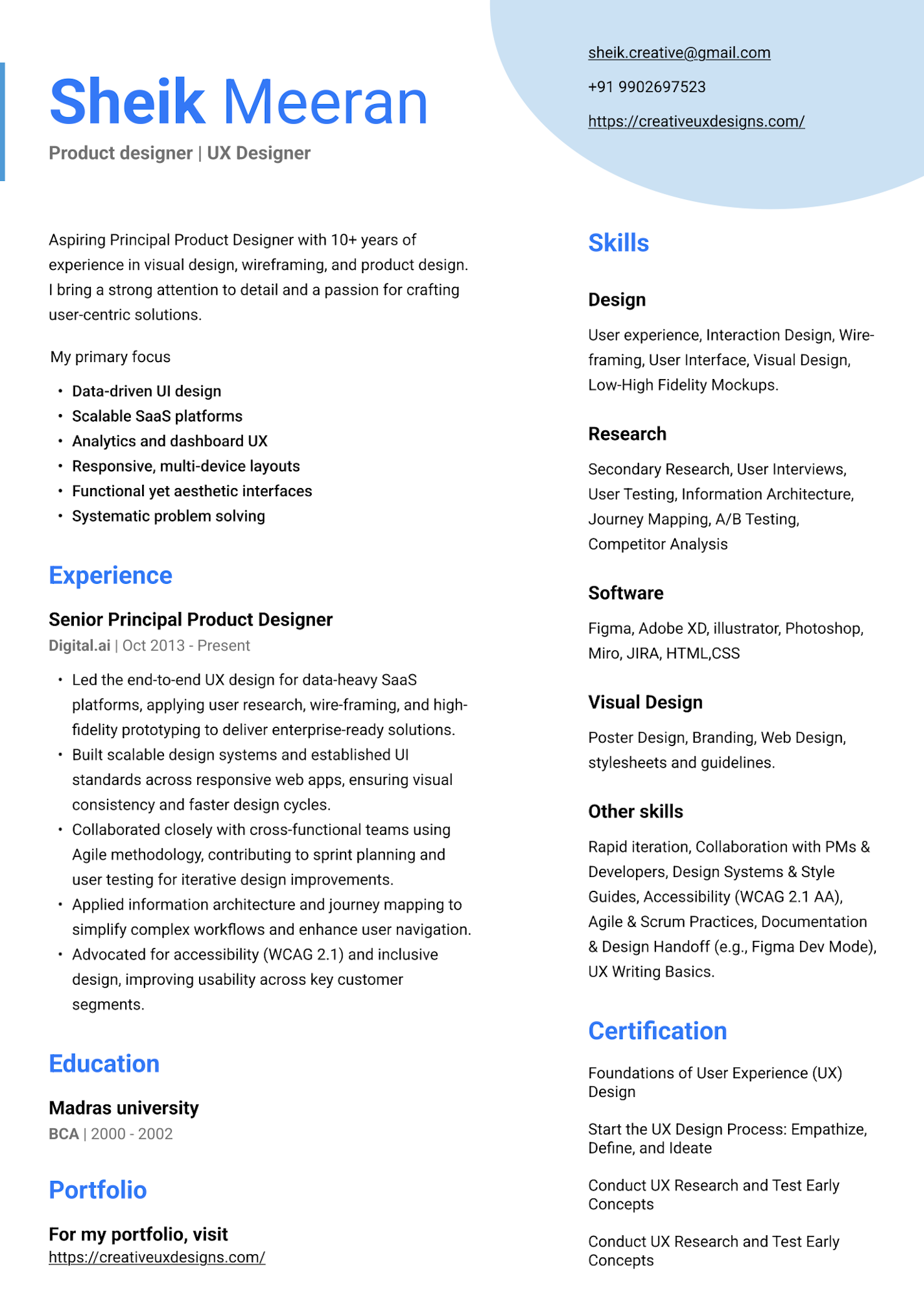 Principal Product Designer with 12+ years of experience in UX/UI design, specializing in SaaS platforms, analytics dashboards, and data-driven design systems. Expert in user research, wireframing, and accessibility (WCAG 2.1), with a proven ability to translate complex data into intuitive, human-centered experiences. Skilled in AI-assisted prototyping, cross-functional collaboration, and scalable design systems to deliver enterprise-ready solutions that improve usability, adoption, and business outcomes.